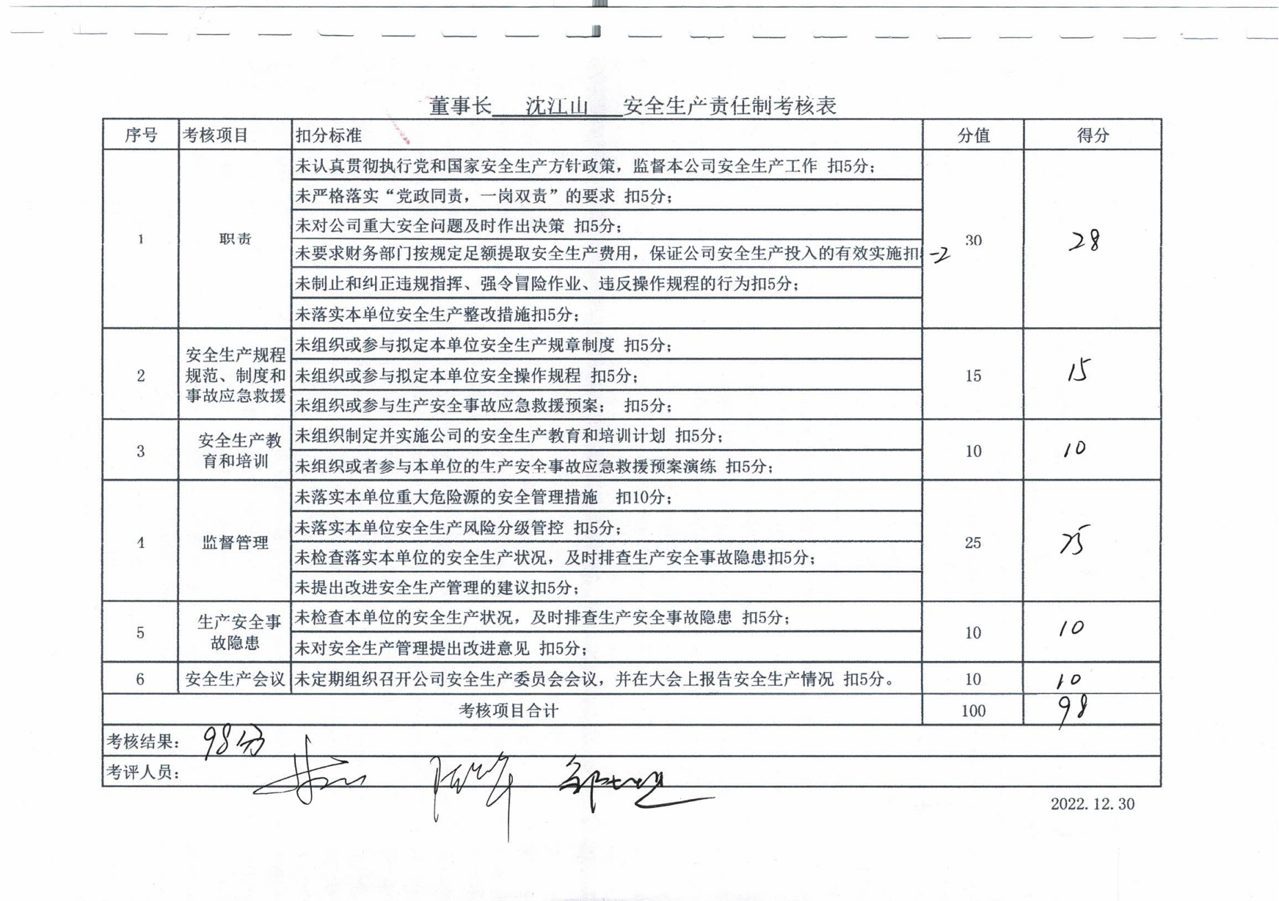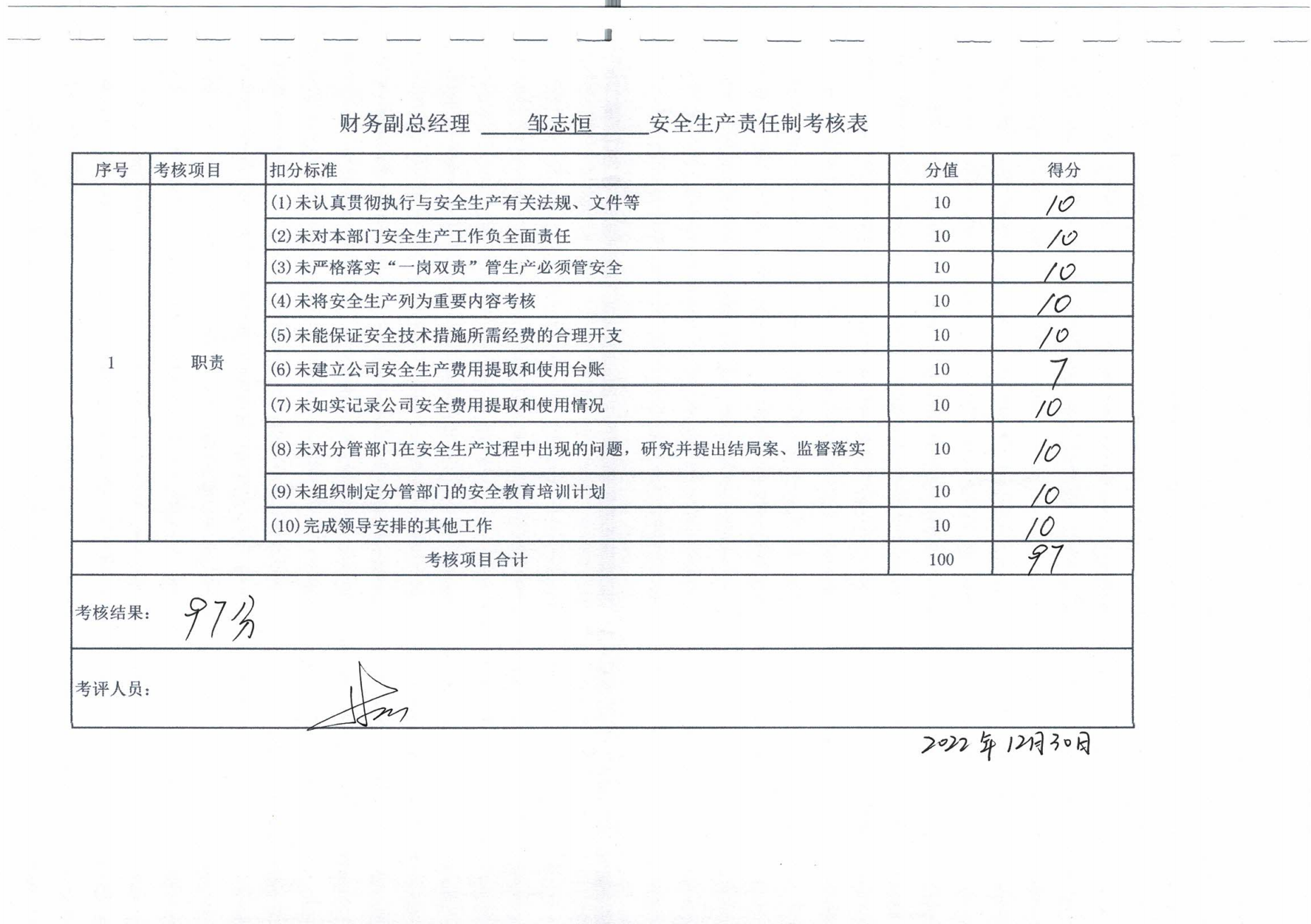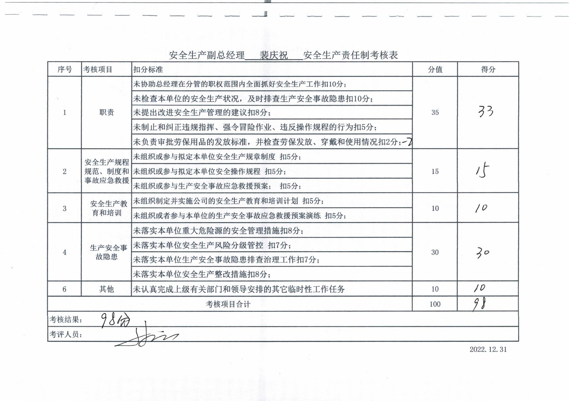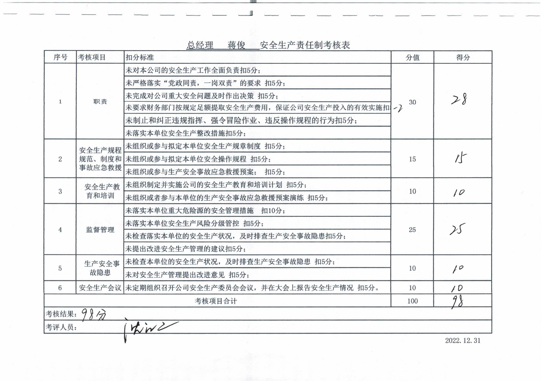 2022年主要負責人安全生產責任制考核公示